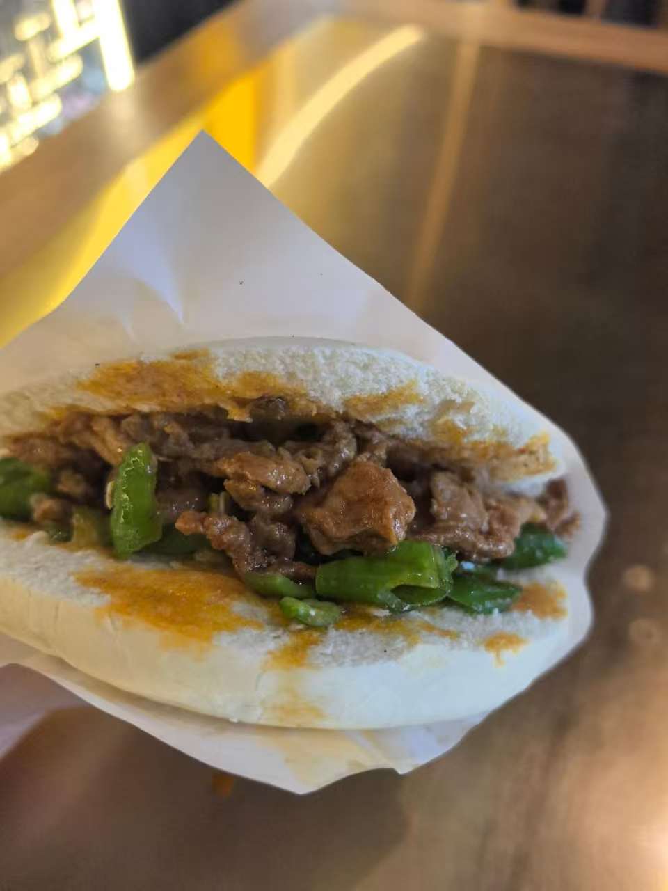 但是吃到了本地的西安臊子肉夹馍,面皮挺硬的,味道一般。